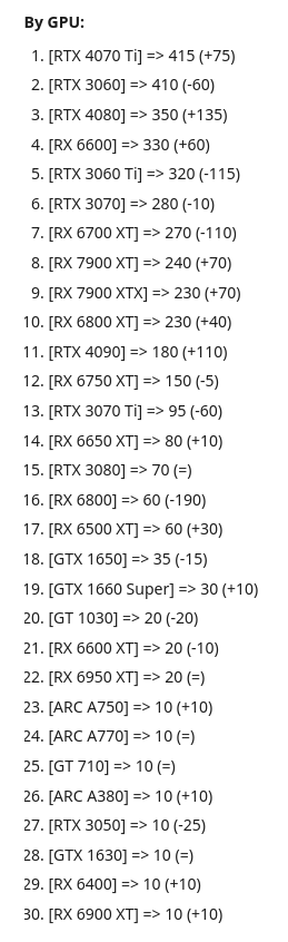 엔비디아 RTX4070Ti가 계속해서 인기 있는 선택이고 RTX 4080이 3위를 차지하고 있음을 알 수 있습니다.