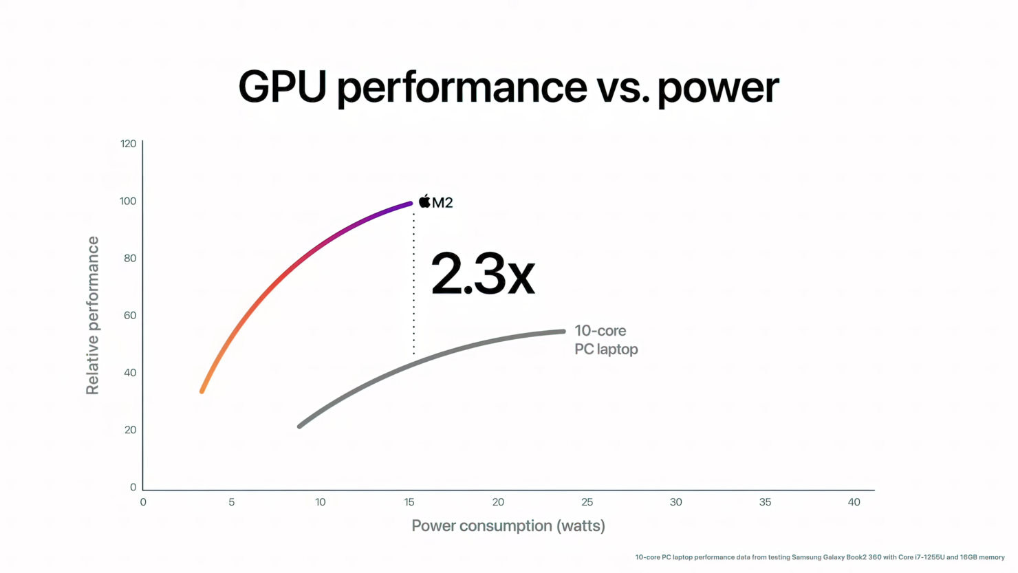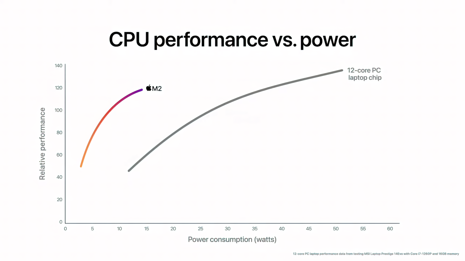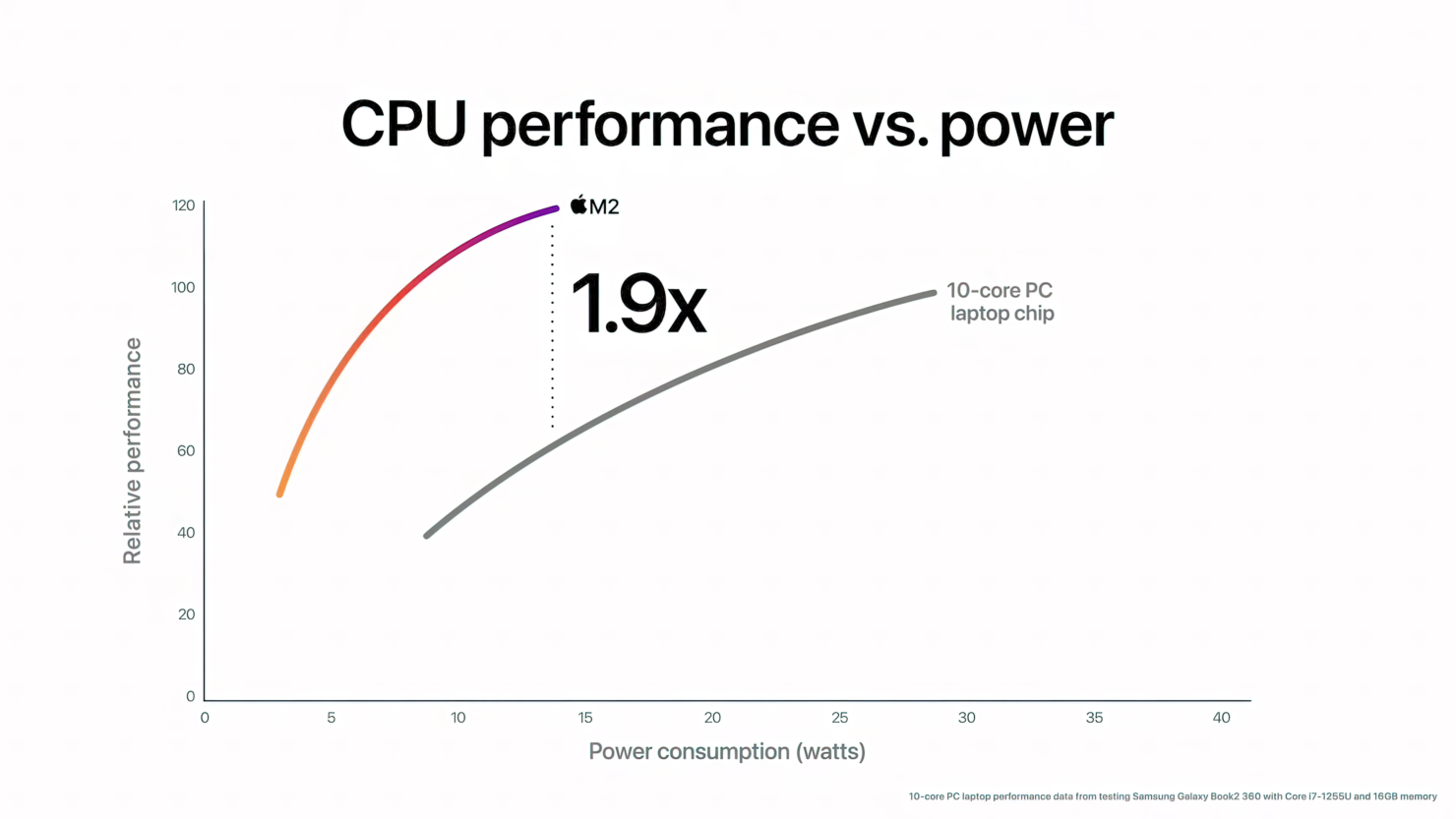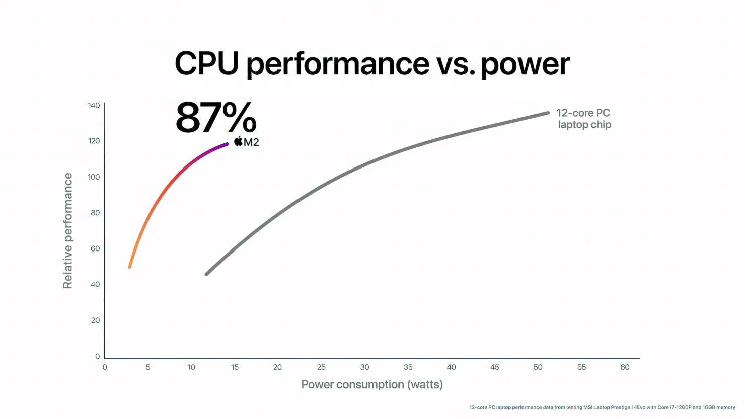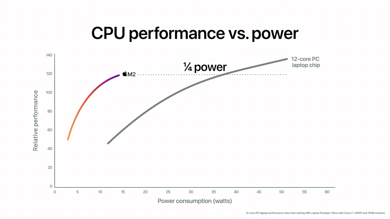 최신 10코어 PC 랩톱 칩과 비교할 때 M2의 CPU는 동일한 전력 수준에서 거의 두 배의 성능을 제공합니다. 그리고 M2는 1/4의 전력만 사용하면서 PC 칩의 최고 성능을 제공합니다. 2 최신 12코어 PC 랩탑 칩(성능 향상을 위해 훨씬 더 많은 전력이 필요하므로 배터리 수명이 짧고 더 두껍고 더 뜨겁고 소음이 많은 시스템에서 발견됨)과 비교할 때 M2는 최대 성능의 거의 90%를 제공합니다. 1/4의 전력만 사용하면서 12코어 칩의