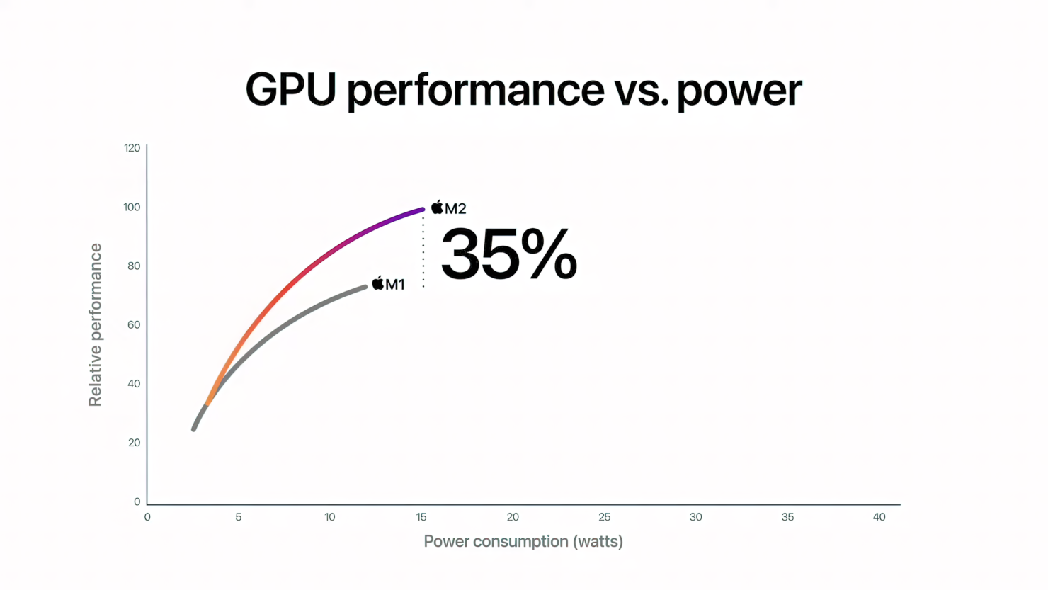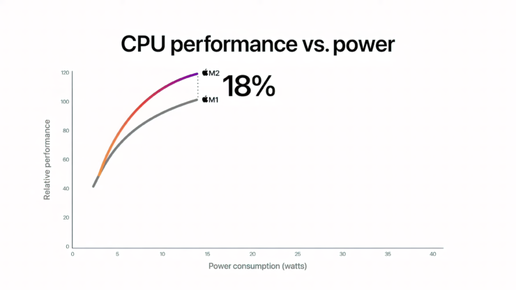 벤치마크와 관련하여 애플은 M2가 동일한 전력 소비에서 M1 CPU에 비해 18% 향상된 성능을 제공한다고 주장합니다.
