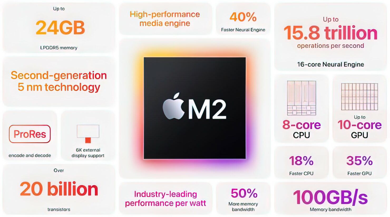 간단히 요약하자면, 애플 M2 SOC는 최적화된 5nm 노드를 기반으로 하며 200억 개의 트랜지스터로 구성된