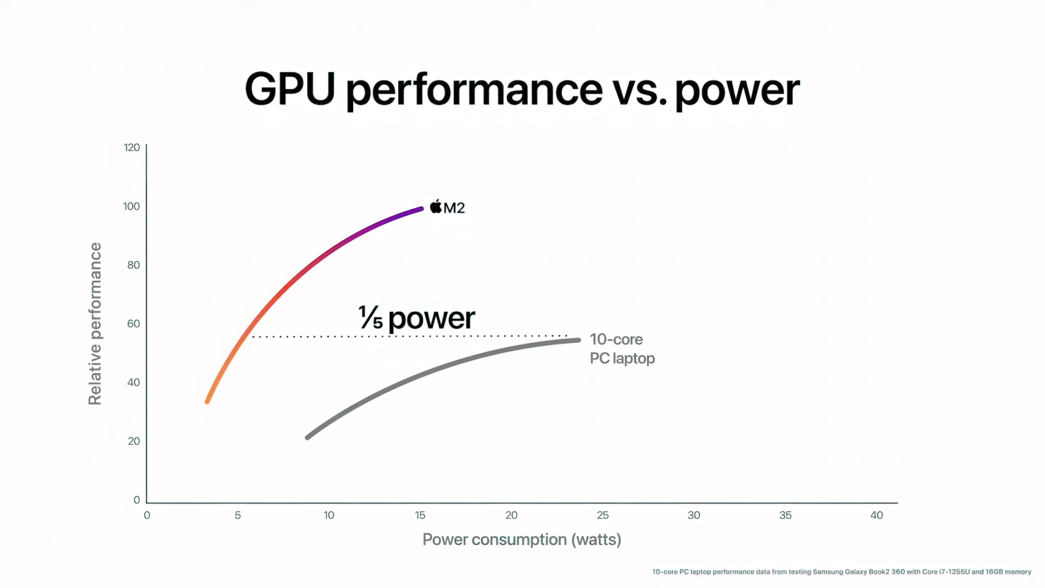 1/5의 전력을 사용하여 최대 성능과 일치합니다. M2의 더 높은 와트당 성능은 그래픽 집약적인 게임을 하거나
