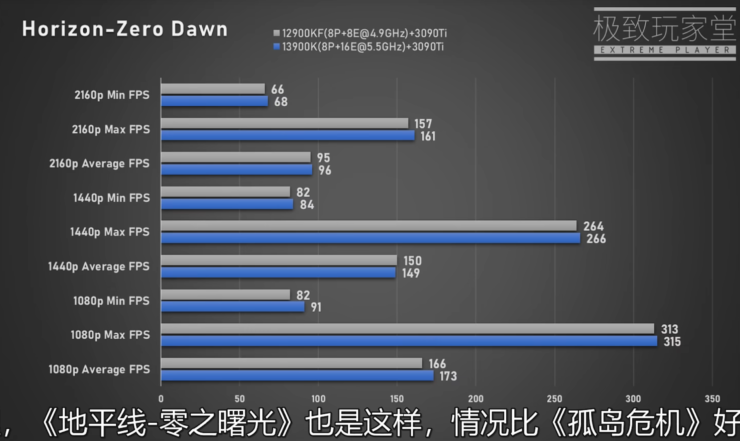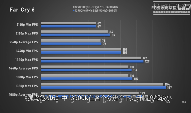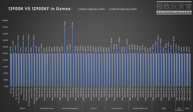 인텔 랩터 레이크 코어 i9-13900K 대 앨더 레이크 코어 i9-12900K 게임 벤치마크(Extreme Player를 통해):